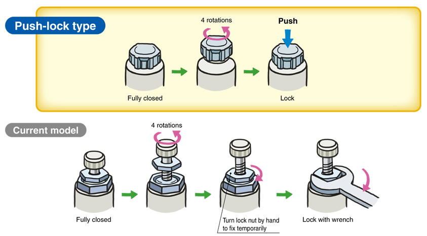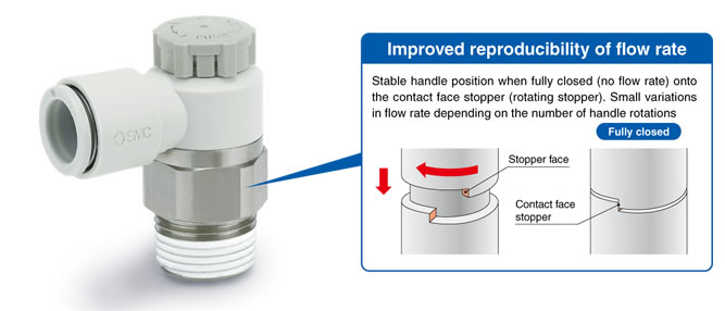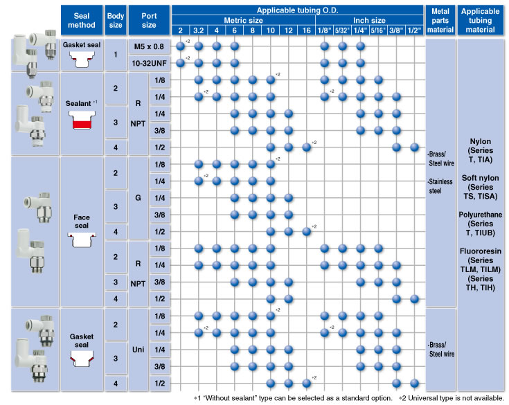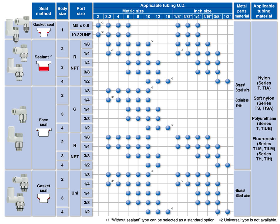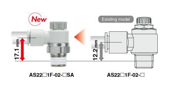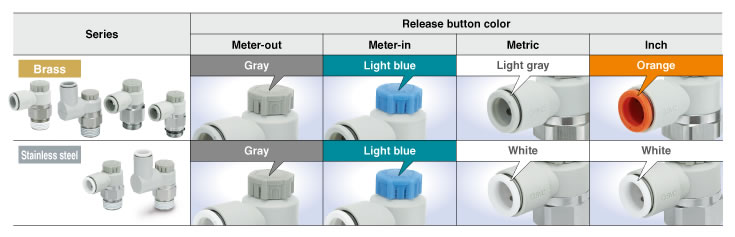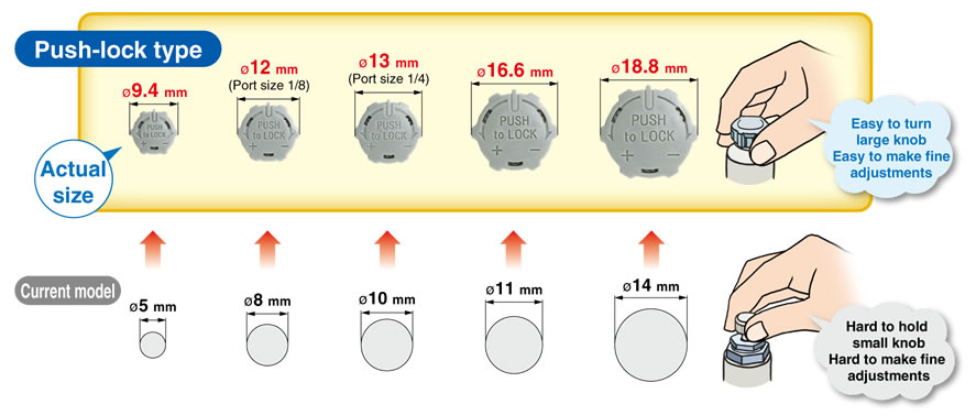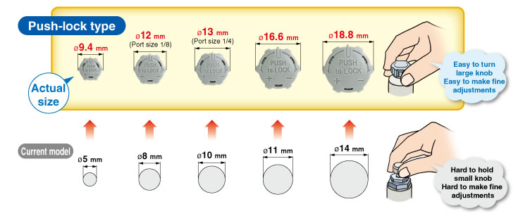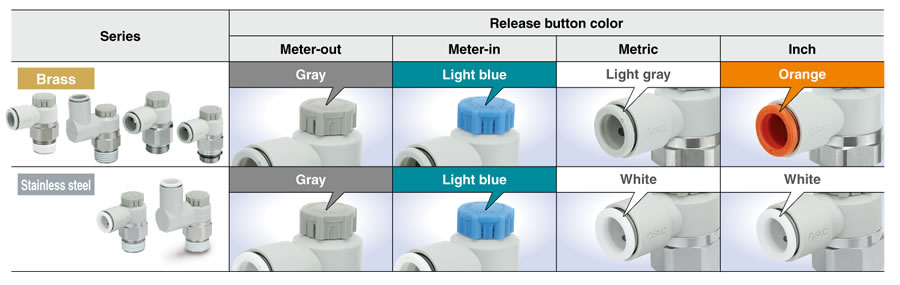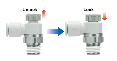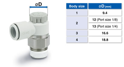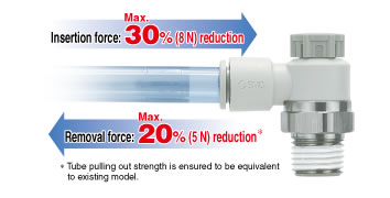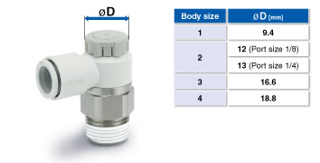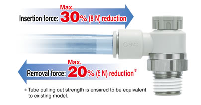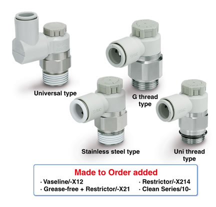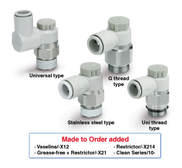 ・Larger knob ・Improved tube insertion/removal Insertion force: Max. 30% (8 N) reduction Removal force: Max. 20% (5 N) reduction* * Tube removal strength is ensured to be equivalent to the previous model. ・Electroless nickel plated type is standard. ・360°swivel piping is possible. (Universal type) ・Restrictor (Made to Order : -X214, -X21) ・Large Flow Type (-X778) |