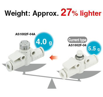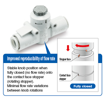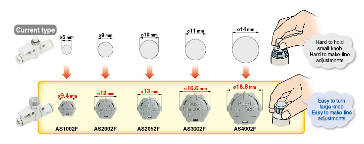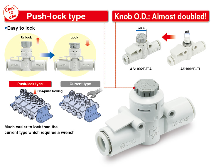 Easy to use push-lock type Knob O.D.: Almost doubled ・Improved reproducibility of flow rate ・Lightweight: Weight reduced by approx. 27% ・Electroless nickel plated type is standard. |