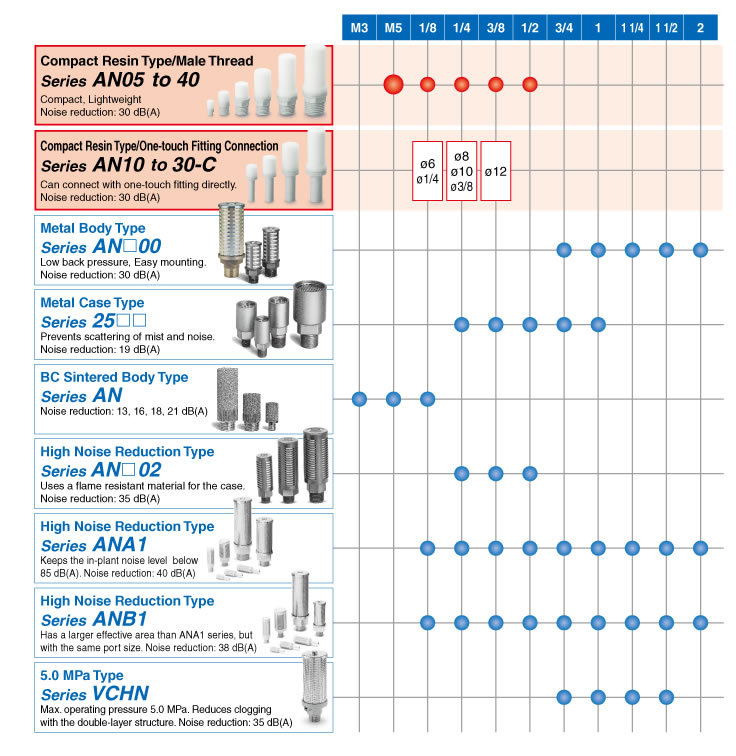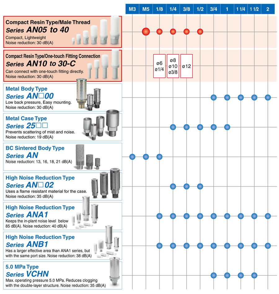 | AN10 to 30-C | ・Can connect with One-touch fitting directly. ・Noise reduction: 30 dB (A) |