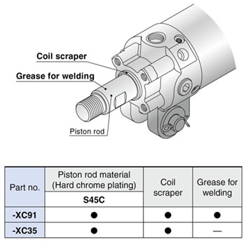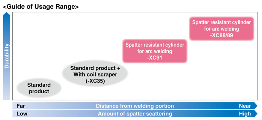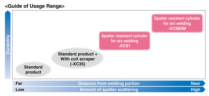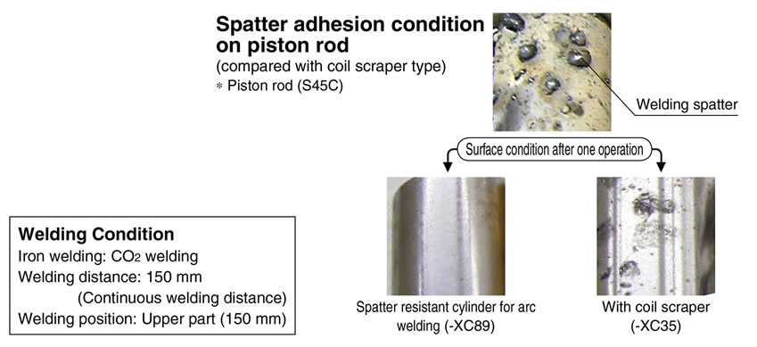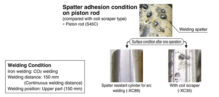 Spatter does not easily adhere to the piston rod of the spatter resistant cylinders for arc welding, which improves durability.